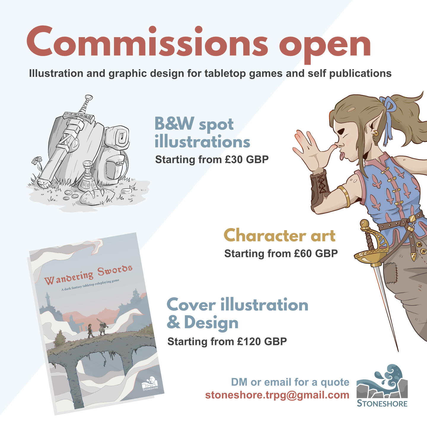 Stoneshore is a platform for tabletop projects by Nathaniel Joseph. Through the Stoneshore imprint, Nathaniel designs games and supplements, as well as creating art and design elements for other creators in the community. He is available for commissions.Nathaniel is a writer and artist based in the North East of England. He worked in the publishing industry from 2017-22, and has a Cert HE in design and innovation.